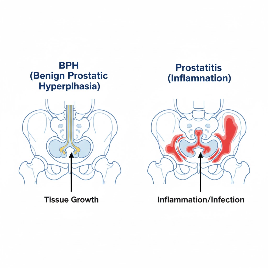 Think of it this way: BPH is like a slowly expanding sponge squeezing a water hose. Prostatitis is like that same hose being irritated, swollen, and painful from a chemical or infection.